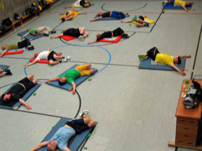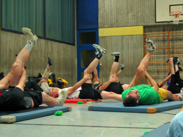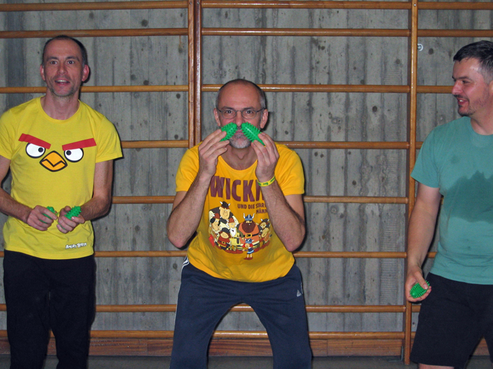 Das Wirbelsäulen-Fitness-Training im November ’12 stand ganz im Zeichen kleiner, froschgrüner, stacheliger Brasils. Die besonderen „Trainingsgeräte“ wurden begleitet von musikalischem und farbigem Fun-Factor. Dem Aufruf „zieh dir was Grünes oder Gelbes an und probier’s aus“ folgten viele unserer Sportlerinnen und Sportler und ließen sich von den Brasils begeistern. Dass die Brasils nicht nur klein und grün, sondern auch sehr effektiv sind, war schnell zu spüren: die kleinen Biester hatten es wirklich in sich und trieben den Schweiß auch aus der letzten Pore.