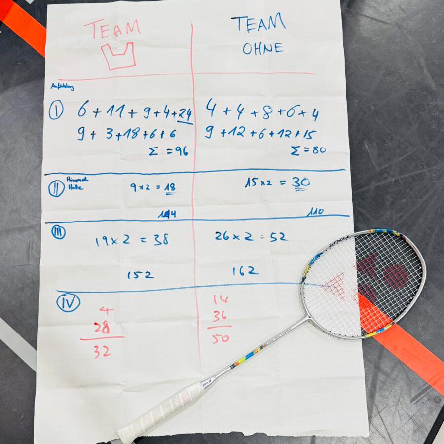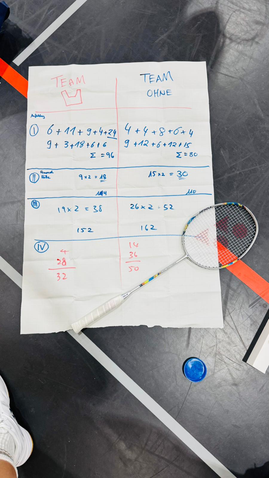 Zum Aufwärmen mussten die Federbälle gezielt in markierte Hula-Hoop-Reifen geschlagen werden. Kurze Treffer gaben 1 Punkt, lange Treffer 3 Punkte. Team Leibchen ging mit 96 zu 80 Punkten knapp in Führung.